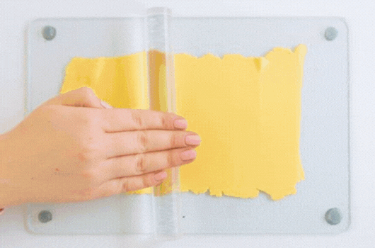 1. Műanyag vagy üveg felületre helyezzünk sütőpapírt, majd nyújtsuk ki rajta a gyurmákat nyújtórúd segítségével kb. 2 mm vastagságúra.