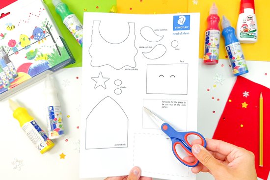 2. Színezzük ki az arcot, az arcocskákat és a csillagot a kalaphoz, majd vágjuk ki ezeket az elemeket.
