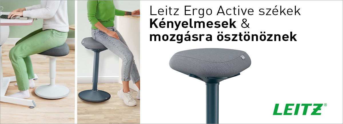 Az új LEITZ Ergo Active székek az egyedülálló Dual Density Foam (DDF) komfortülésnek köszönhetően kényelmes és támogató ülést biztosítanak. Az ülő és álló verzióban elérhető székek magassága könnyedén szabályozható, billenő funkciójuk révén pedig mozgásban tartják a törzs- és lábizmokat az ülőmunka közben is, ezáltal erősítik a hátat és a törzset.