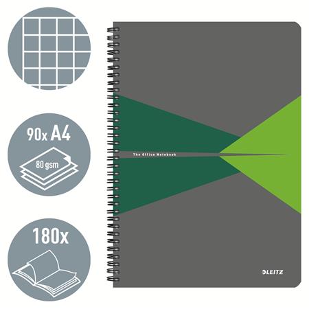 Spirálfüzet, A4, kockás, 90 lap, PP borító, LEITZ "Office", szürke-zöld